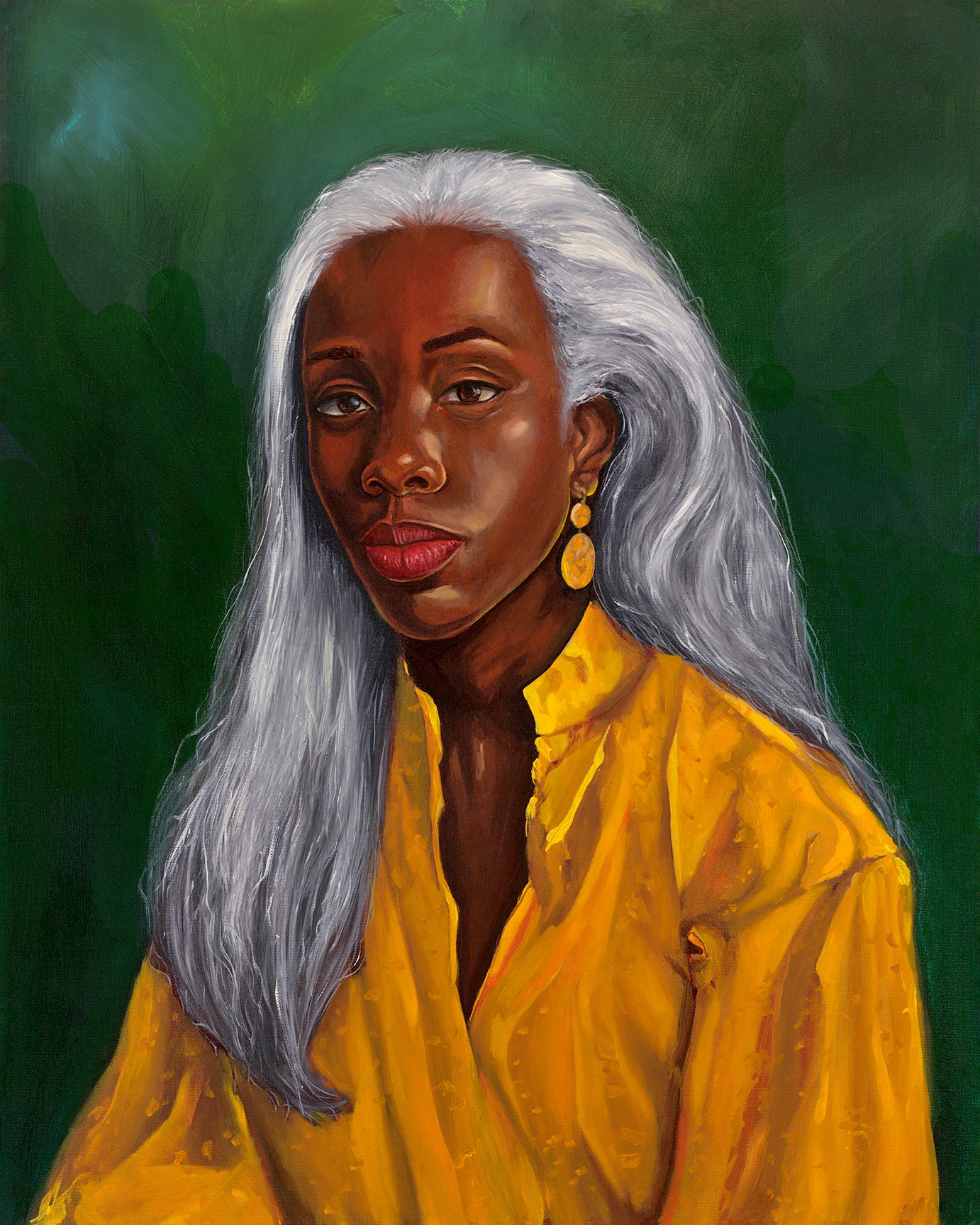 “Golden” is a portrait of quiet wisdom and radiant confidence. The figure sits with a calm, steady gaze, her silver hair cascading like a crown, her golden blouse glowing against the deep green background. There’s a richness to her presence that feels both timeless and deeply rooted.