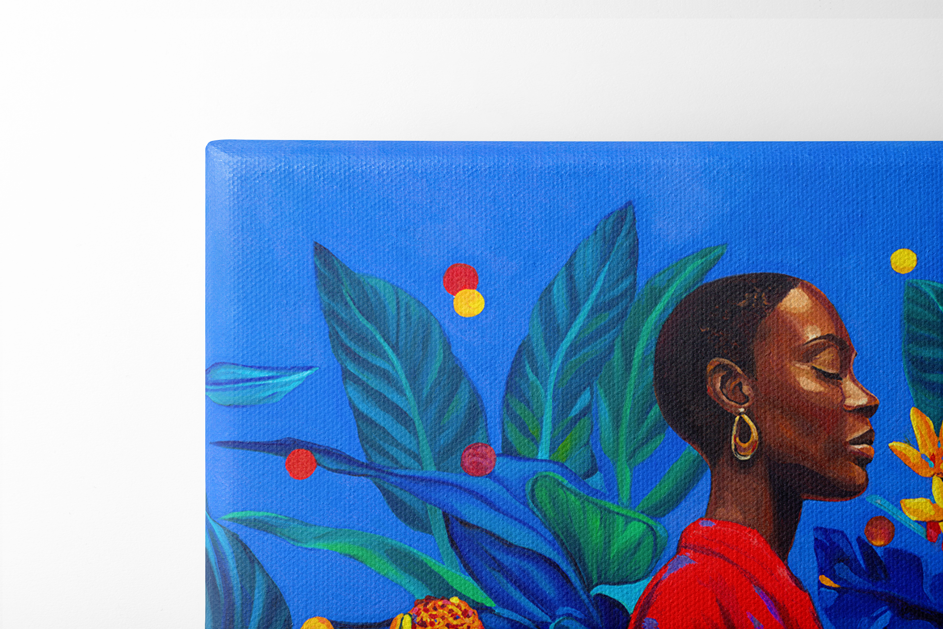 “Abundant Dreams” is an invitation to breathe deeper and believe bigger. The figure stands with eyes closed, resting in a moment of quiet certainty, wrapped in vibrant reds and surrounded by a lush world overflowing with color. Everything around her feels alive. Growing. Becoming. It’s a landscape of possibility.
