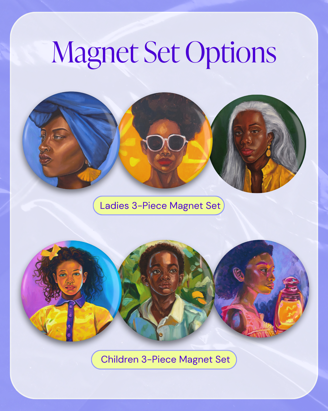 Add a pop of joy to the places you see most. This 3-piece magnet set features vibrant miniature artworks that turn your fridge, locker, or office board into a tiny gallery. Each magnet is 2.25" across, compact enough for daily use but detailed enough to shine as its own little piece of art.